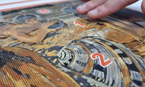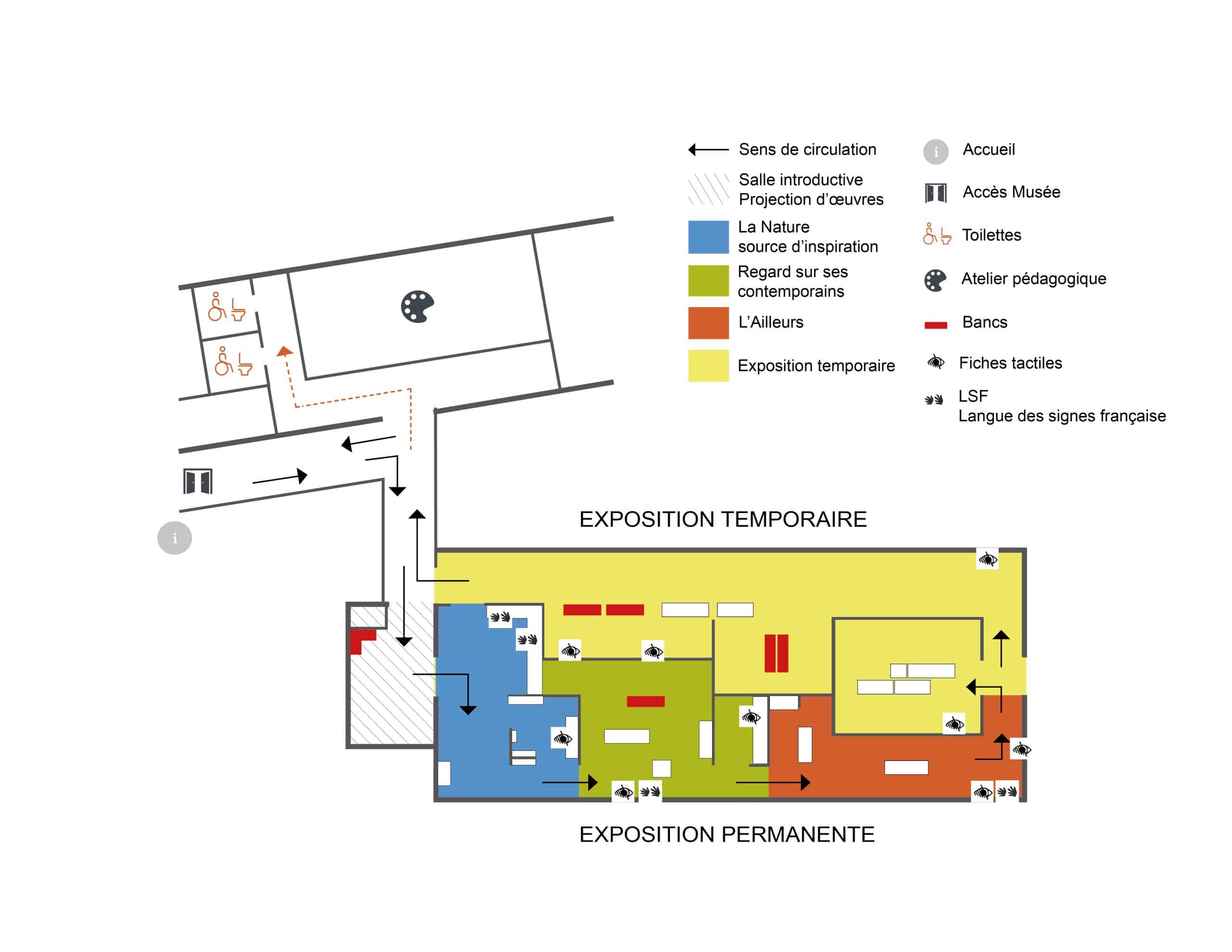 Des fiches présentent des reproductions d’œuvres en relief, des textes en braille et des textes en caractères agrandis. La découverte de ces œuvres du parcours permanent et de l’exposition temporaire est complétée par des audiodescriptions téléchargeables sur smartphone via des QR-codes.